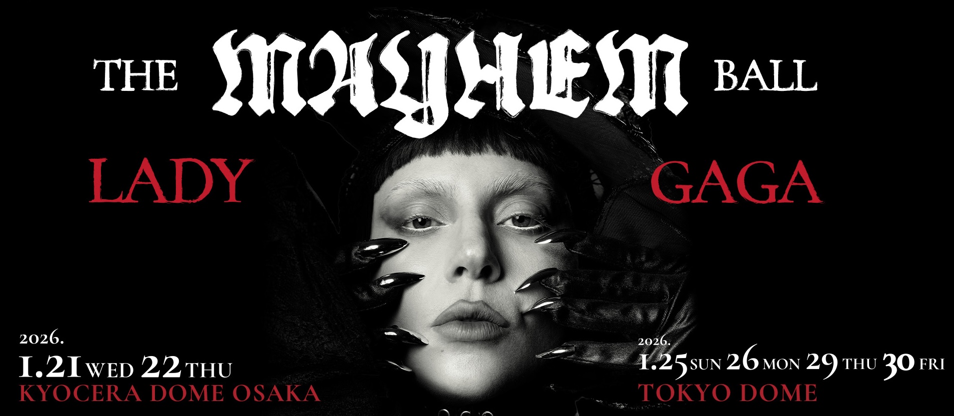 Global pop icon Lady Gaga brings her theatrical arena tour “The MAYHEM Ball” to Kyocera Dome Osaka on January 21–22, 2026, marking one of the biggest international concerts of Osaka’s winter season.