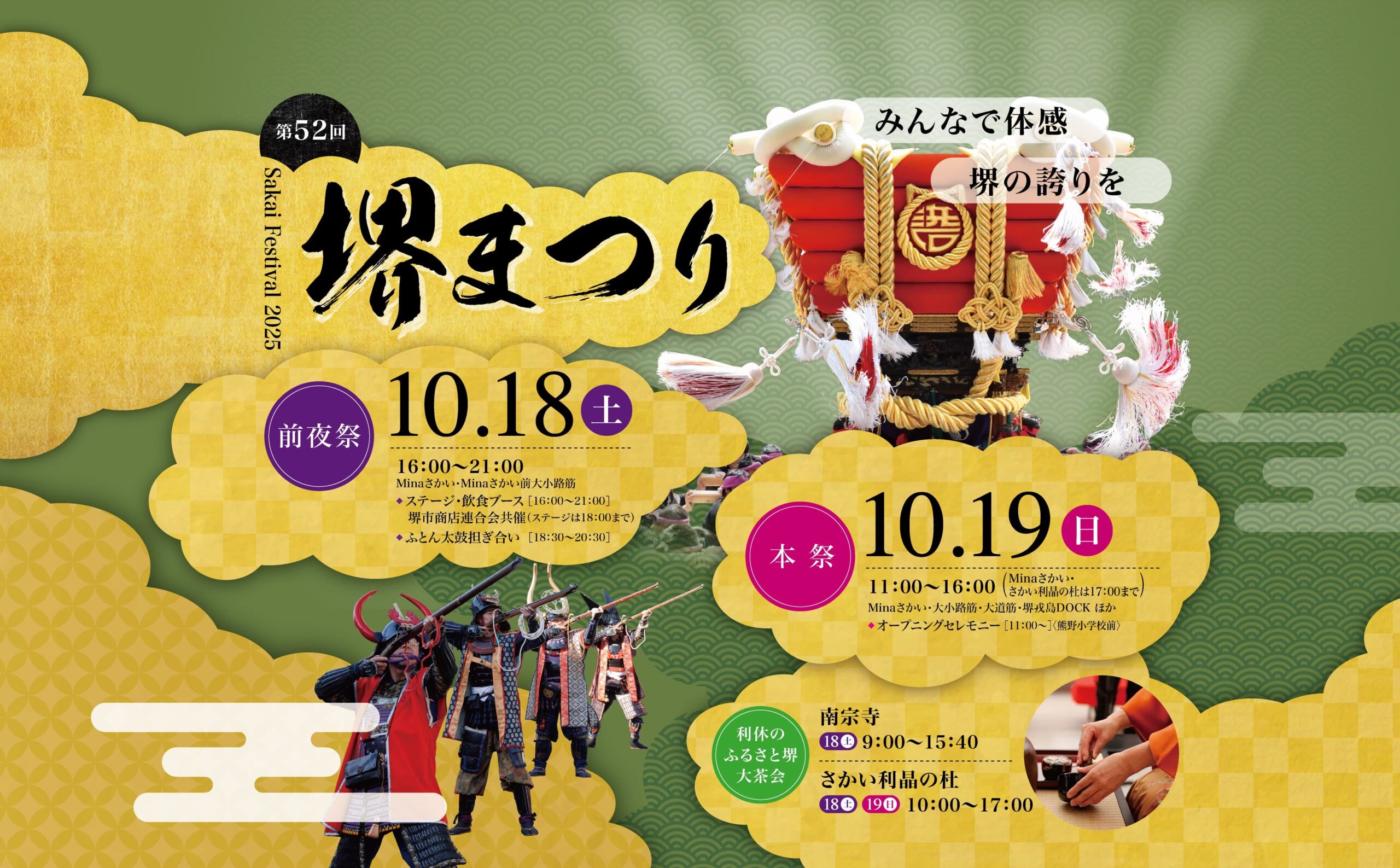 16:00– Opening performance (Sakai Cheerleading Club MARINE), ceremony; followed by stage acts: Kagura, Sakai Girls Revue, Little★Star – team Spica (mini musical), Sakai City Opera (mini concert), Sendai Suzume Dance “Date no Mai,” and a Yoshimoto comedy block (Yoshida-tachi, Fujisaki Market, Shampoo Hat). 18:00Futon-daiko send-off ceremony.